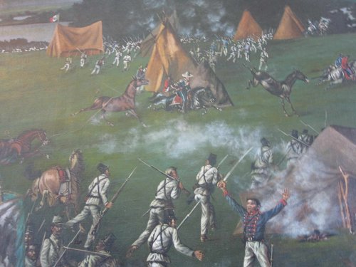 James Bowie was indeed dead or at least dying at the time but the painter made sure that he was very much alive in the painting of this historic battle, (although 'The Battle Of San Jacinto' was a more significant one). The Alamo fell on March 6th 1836. There is a somewhat humourous depiction of Santa Anna himself on a donkey as little more than a caricature. This magnificent painting shows a mighty and brutal battle scene with Santa Anna fleeing. The painter had a sense of humor.