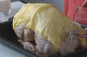 In case you haven't had the nerve to try out cooking your turkey in muslin, here's how. You just have to take my word that it works the first time you do it. You'll die of shock when you take the mummified object out of the oven, but just wait till you see what awaits you inside. Don't have the oven too hot, that's the only thing, or you could end up with a charred mess!