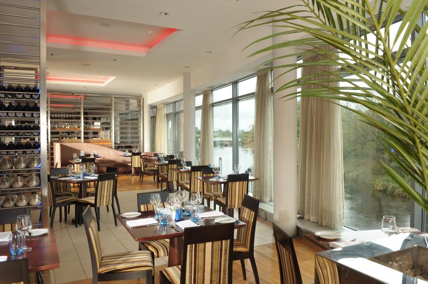Dining and socialising options are between the very spacious first floor Absolute Bar & Grill, which overlook the river and leafy bank opposite, with a decking area for sitting out.