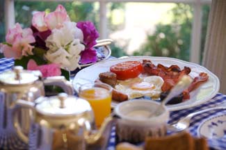 In the morning the Yeats Rooms restaurant is transformed, with cheery blue and white checked tablecloths and napkins setting the scene for a feast that will start the greyest day on a high. Like every meal at Ballymaloe, 'fresh, local and seasonal' is the philosophy. The buffet offers porridge, made with Macroom stone-ground oatmeal, Bircher muesli made with their own apples, seasonal fruit compotes and home-made yoghurt from the cookery school. Fresh breads - Ballymaloe brown yeast bread, traditional Irish soda breads, spotted dogs and scones - are accompanied by homemade butter and preserves, and the hot cooked to order options include the traditional cooked breakfast made with Ballymaloe farm eggs, bacon and sausages. Honey is from their own hives - and even the coffee is hand- roasted on site by The Golden Bean, which operates in a farm building near the Ballymaloe shop and café. This wonderful breakfast experience says a great deal about Ballymaloe.