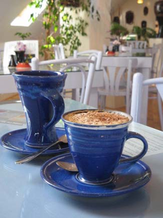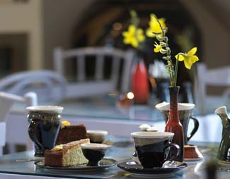 Everything is served on Louis Mulcahy pottery, of course – the coffees come in large pottery mugs and cakes are accompanied by freshly whipped cream in tiny cute ceramic urns.