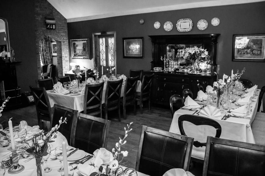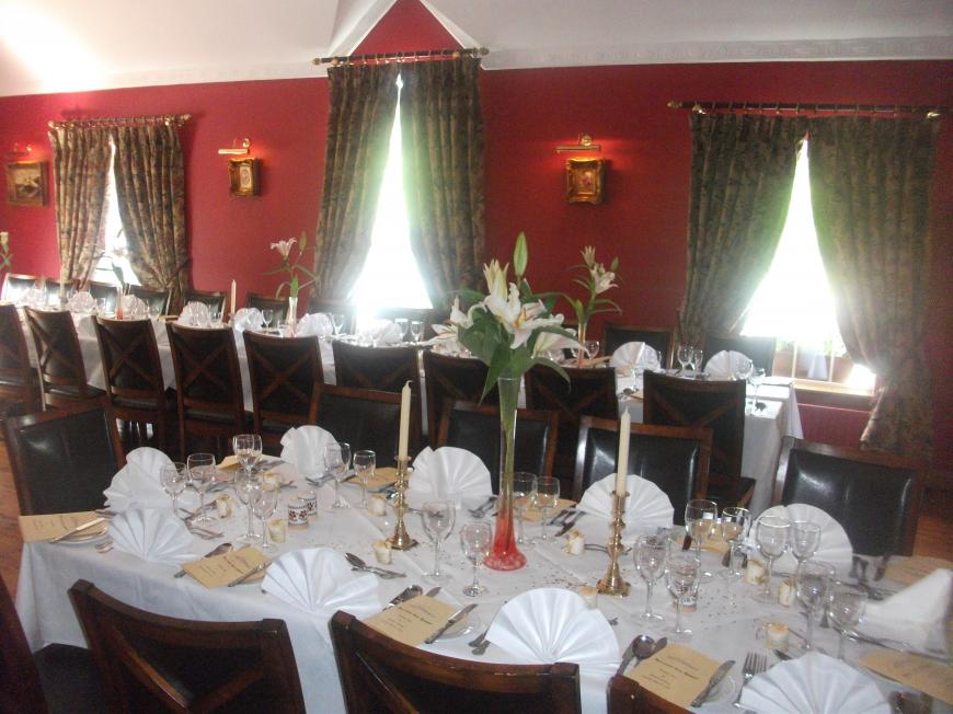 Menus are balanced, to include fish, poultry and vegetarian choices, but local meats are especially good, and generous portions of seasonal vegetables are served separately. Like the bar, the restaurant has an open fire and, with red walls, white ceiling, mahogany furniture and crisp white linen, it is cosy and pleasingly traditional, making a special yet relaxed setting to enjoy a good meal.