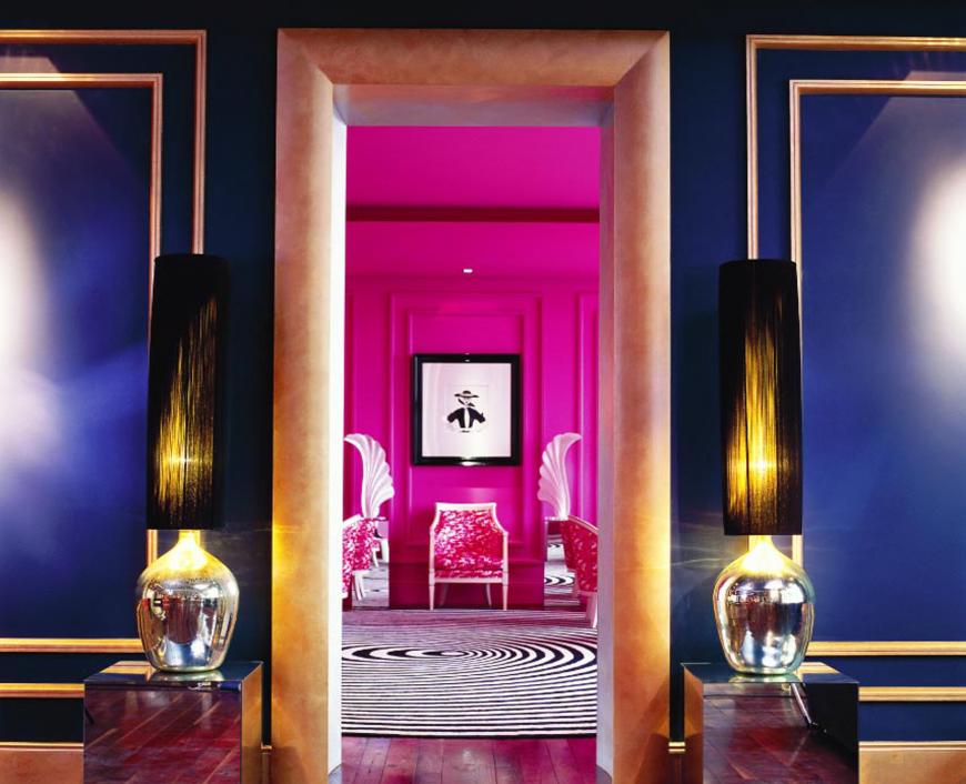 Dining room furnishings, in varied slightly decadent colours, contrast with the crisp, white table linen, and superior glassware and silver add to the air of opulence.