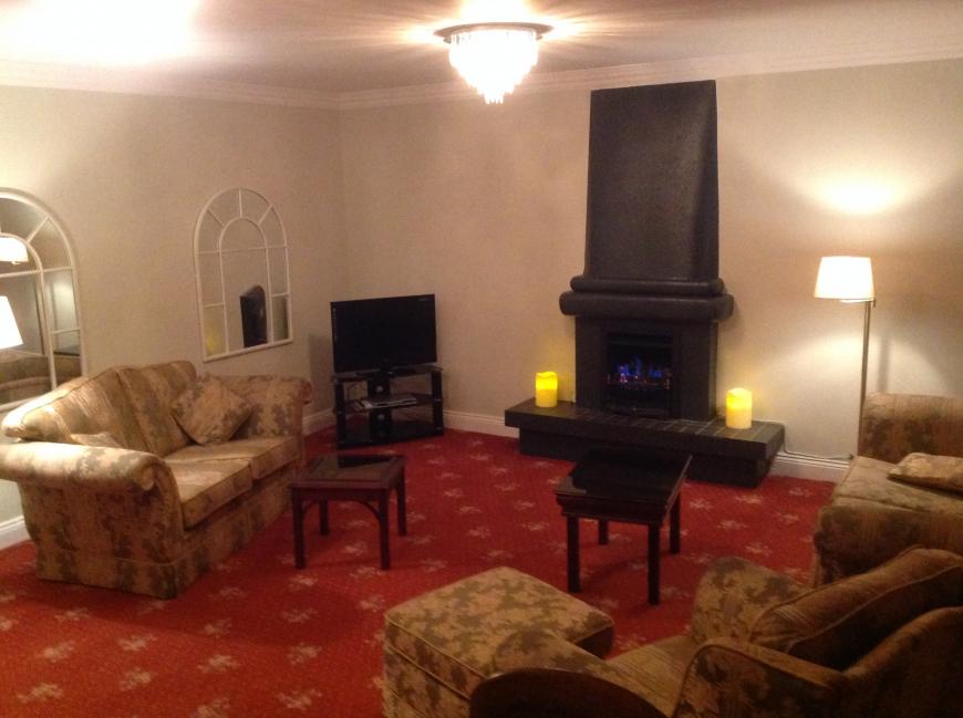 A guest sitting room with an open fire makes a cosy retreat on dark winter evenings.