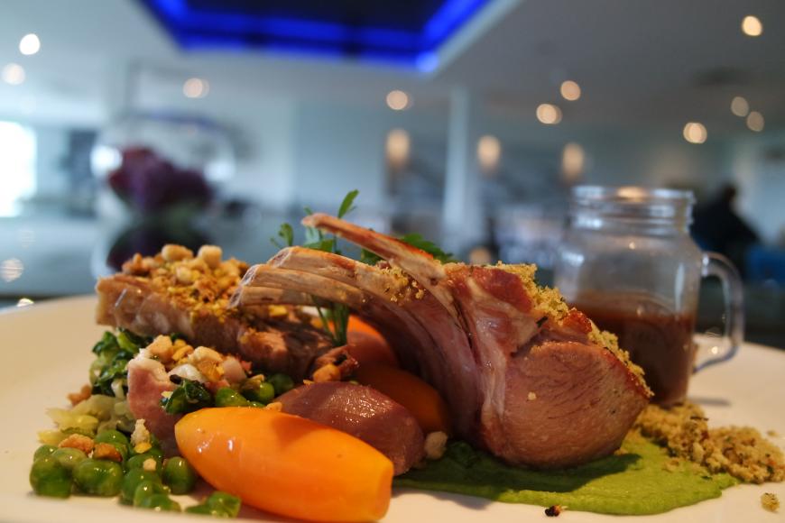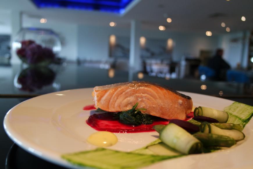 Entrance is through an attractive traditional bar at the front, then through to a big, bright split level dining room with big windows overlooking a landscaped garden and sea at the back; the décor is basically simple but, with quirky details and bright turquoise accents in fun cushions and lovely fish-themed murals, the effect is fresh and original.