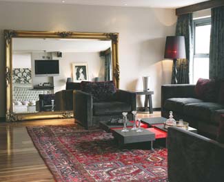 The dark tones continue among the bedrooms which have darkwood floors and subtle variations of lighting and fabrics to make rooms distinctive from each other. Large old-fashioned gilt-framed, mirrors are a feature, especially leaning against the walls on the corridors – a design statement that was used long before it was pipular lends a homely touch.