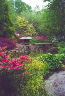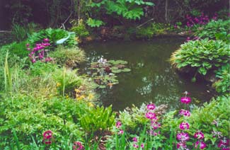 The streamside bog garden, full of water loving plants gives way to the Japanese Garden where, beside a cascade, an obliging rock represents Mount Fuji. When Mrs McMahon sadly lost her husband Harry in ‘96, trees and shrubs given by friends began to appear on her doorstep, so she began another garden in his memory. More trees and shrubs arrived and were planted in the natural rock garden beside the stream in what promises to be the loveliest of all the areas.