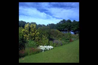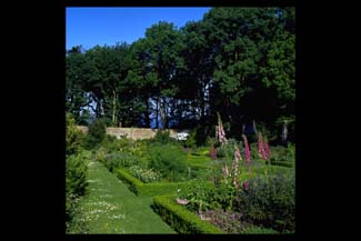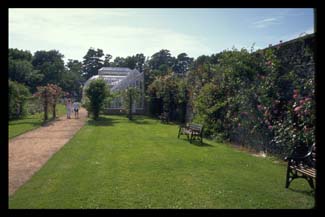 The garden has the benefit of old bones combined with new ideas. The Council have restored the gardens near the house, adding a new rose garden planted with hybrid tea roses around a lily pond and climbing roses ingeniously grown over a pergola of chains. Manicured lawns, a herbaceous border, the beautifully restored glass house with peaches, nectarines and grapes all provide a traditional note. A national collection of potentillas with over 300 varieties has been planted in this area.