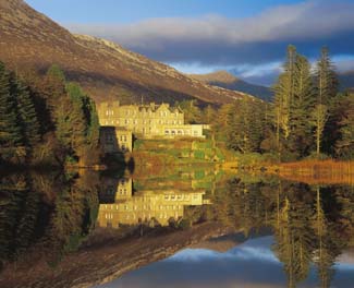 This crenellated Victorian mansion is renowned as a fishing hotel and enjoys a most romantic position in 450 acres of ancient woodland on the banks of the Ballynahinch River.