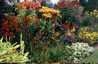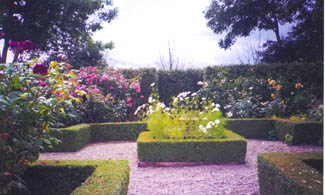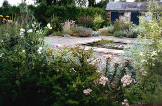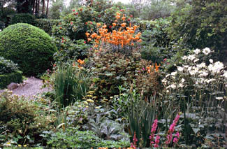 The soothing silver,white and blue planting around the pond garden, with plants like wormwood, campanula, and the perfumed seclusion of the rose garden, where shrub roses are screened by a hedge of Thuja plicataand restrained by a cruciform of meticulously clipped box, are a complete contrast to both the sinister black plants of the Funereal Border: Physocarpus opulifolius ‘Diabolo’, Pittisporum tenufolium ‘Nigricans’, and the jazzy reds and yellows of the hot border - here punchy crocosmias, dahlias and day lilies are offset by cool green foliage and sober plum foliage plants.