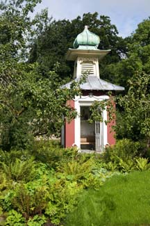 In late spring it’s hard to know where first to feast your eyes first in the 1.8 acre walled garden at Bellefield. You could drink in the sight of a double iris walk inspired by Monet’s garden at Giverney, gaze spellbound into the golden hearts of unknown French peonies which came home with Angela or be fascinated by an extradorinary gazebo, with an exotic Indian dome, gothic windows and a fernery at its feet.