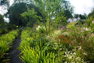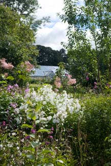 The garden is still evolving. But looking at lengthy summer borders, one with a hot colour scheme of scarlet punctuated with unusual varieties of medlar and in another with dark crimson dahlias interspersed with the aristocrats among French roses like ‘Mme Isaac Perreire,’ Comte de Chambord’, it is hard to believe that three years ago the only way into the garden was to crawl in on hands a knees. After undergrowth and saplings were cleared the grid of paths emerged and Angela retained the old fruit trees and a few samplings to give height and shelter.