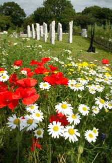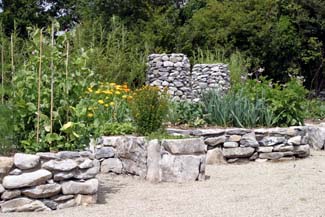 The festival of Lughnasa (pronounced Loo-na-sa) in early August marks the beginning of the harvest and the transition from summer to autumn. Named after Lugh Lamh Fada, the hero of the mythical Tuatha de Dannan, it is a time of plenty and celebration. Mounds represent the constellation of Orion, which some Celts associated with Lugh. Stone vegetable beds in spiral shapes stand to each side and host an abundance of edible plants: vegetables, flowers and herbs. Two interlinked grassy circles are enclosed with standing stones, making spaces for feasting and dancing. As we approach the end of the cycle it is time to reflect, give thanks and celebrate all that has come to fruition. Three yew trees stand outside the exit from Lughnasa, symbolising the moment of death. The cycle is now complete, and the possibility of re-birth beckons as a new cycle begins.