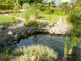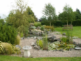 A pond and waterfall guarded by a weeping willow became the central feature of the back garden with a bridge made from the Williams’ former hearth stone. Beside it waving tresses of pony tail grass Stipa tenuissima and plumes of gigantea contrast with the luxuriance of a bog garden with primulas and ligularias.