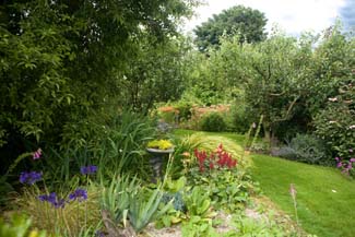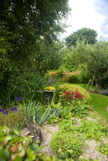 There’s a pretty composition featuring blue garden furniture and the pleasing yellow of Anthemis tinctoria ‘E.C. Buxton’ and a show stopping statuesque Thalictrum ‘Elim’nearby, a laburnum walk ,gravel garden and a new woodland area. The traditional front garden is carpeted with purple crocuses and double daffodils in Spring.