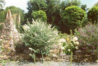Starting in 1994, they reclaimed the garden bit by bit from brambles and piles of stones, uncovering a spring well which became the basis for a water feature, laying a path and terrace by the trout filled river, and creating compartments with hedging and reclaimed stone, and making topiary features from box cuttings. Difficulties created by the stony old industrial site were turned to advantage - the old dye vats, for instance, were lined and turned into a swimming pool, self filtered by beds of reeds, iris and water plants.