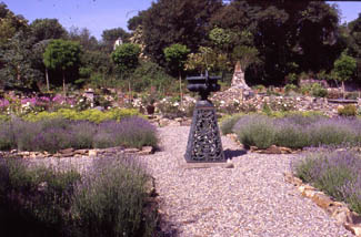Today it is a wonderfully structured garden which is constantly evolving. Off the central vista down a gravelled path intriguing areas await discovery, a hot garden planted with monarda, Crocosmia‘Lucifer’ and the curiously named rose ‘Parkdirektor Riggers’ . Further delights are an aromatic African garden with a Moroccan door, a berceau or fruit cage walk twined with crab apples and wisteria, a lily pool guarded by agapanthus and bonsais, a parterre planted with a trio of lavenders ‘Munstead’ , ‘Hidcote’ and L angustifoliaand there is a sculpture garden, and even a maze designed by Clary.
