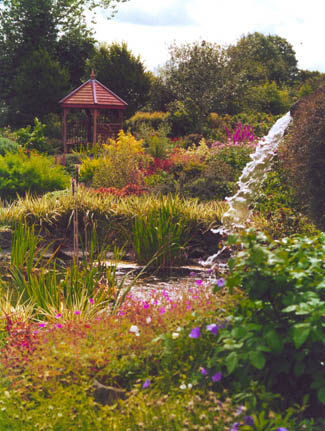 The star of the show is the Moon House Grotto, where a waterfall cascading from a mound of rocks, tumbles past a circular window into a lily pond. Around it gravel paths meander around raised beds with a wonderful collection of herbaceous and alpine plants, and past a whole variety of features, from a gazebo to a stream garden.