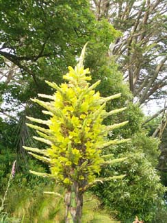 wiggle through luxuriant growth pastcordylines, bamboo forests,Beschorneria yuccoides, groves oftree ferns, embothrium and myrtles(including the variant Luma apiculata‘Glanleam Gold’ with cream bordered leaves which originated in the garden.)