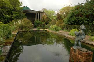 The walled garden is laid out as a series of compartments leading into each other, with topiary and statuary marking the entrance to each new room: the Italian Loggia garden features a pool and stone pillars, the ‘quarter garden’ hosts a fine display of irises and roses, whilst the ‘hot’ herbaceous border is home to old-fashioned plants including the red Maltese cross lychnis.