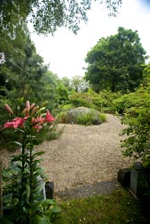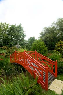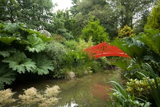 As you might expect from the only man in Ireland to receive a Thai lotus- growing bowl as a retirement gift, a strong oriental influence runs through. In the Zen circle, sheltered by an arc of azaleas, the central rock is carved with the traditional Kanji symbols “Snow, moon, flowers”. Across the lake an enticing island is reached by a Chinese bridge, its dramatic scarlet echoed by the flowers of Corosmia ‘Lucifer’ and swags of Tropaeolum.