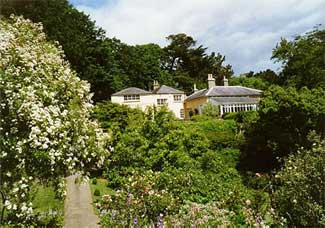 Below a small Palladian house looking out to Dublin Bay, lie steep stone terraces, built in the nineteenth century. Hundred year old trees give the three acre garden a romantic setting. Here are many unusual features: a Victorian dogs' cemetery, a sundial, a geometric kitchen garden, a small canal, old roses and herbaceous borders, leading to the pools of a Robinsonian wild garden. Beyond are woodland walks overlooking the Dargle Glen.