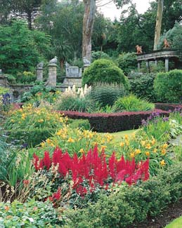 Offering beautiful contrasts of mood, the gardens move from the geometric parterres of sizzling reds, yellows and oranges on one side of the Italian garden and silvers and mauves on the other, to the cool greens and curvaceous design of the Spanish garden with its circular pool overlooked by a pantiled loggia and screened by arches of clipped leylandii.