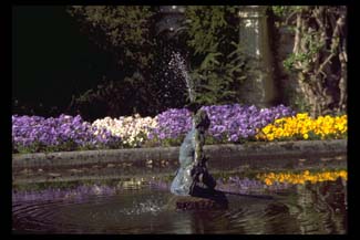 Beyond the lake, paths lead through groves of towering specimen trees and on to the Dolphin pond set in a sylvan glade. A very splendid gate adorned with gilded roses, thistles and shamrocks symbolising England Scotland and Ireland (but no leeks, perhaps for decorative reasons) provides the link back to the formal areas of the garden, via double herbaceous borders.