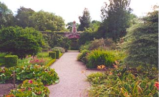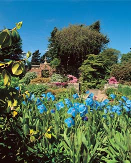 Beside the arched gateway there is a silver and blue garden and although the grid of paths is formal the planting is eclectic, with a mix of shrubs, trees, bulbs and herbaceous plants. There are unexpected carpets of the autumn crocus, corners where Southern hemisphere plants like agapanthus varieties flourish - and, among the more spectacular sights to be seen, are the summer displays of snowy hoheria flowers, drifts of azure meconopsis in the shady borders and showy magnolias.
